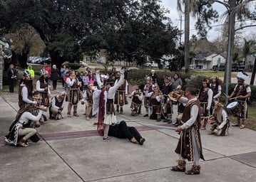 Los matachines denotes a traditional religious dance and the dancers, musicians, and elders who participate in it. Its roots go back to a type of widespread medieval sword dance called a morisca. Originally, the dances acted out the battle between Christianity and paganism. The Spanish brought the ritual with them to the New World, where over time it incorporated Mexican, Indian, and American religious and social symbols. Most modern versions rely heavily on representations of the Virgin Mary and the Holy Cross. The dance is usually performed in connection with major liturgical feast days such as Christmas. It is often performed by twelve to eighteen dancers who represent such characters as El Monarca (Montezuma), his bride (Malinche), El Abuelo (the Grandfather), and El Toro. The principal dancers are supported by Los Capitanes and Los Matachines, groups of male dancers. Versions and meanings of the dance vary depending on the identity and traditions of the performers.